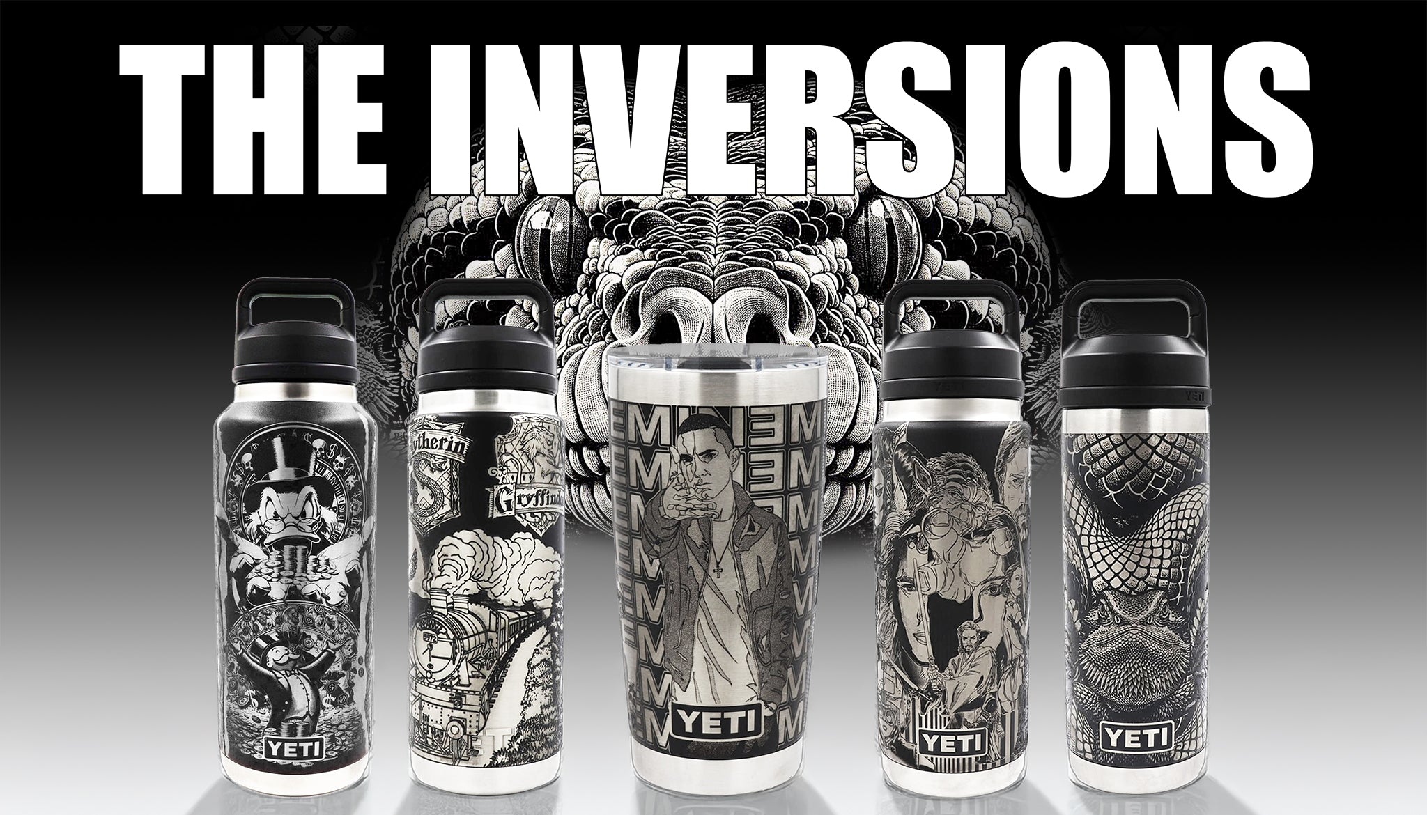 The Inversions collection flips the script - high-contrast engravings that hit differently. Built on darker YETIs, these designs glow from the shadows, revealing layered worlds through bold, inverted engraving.